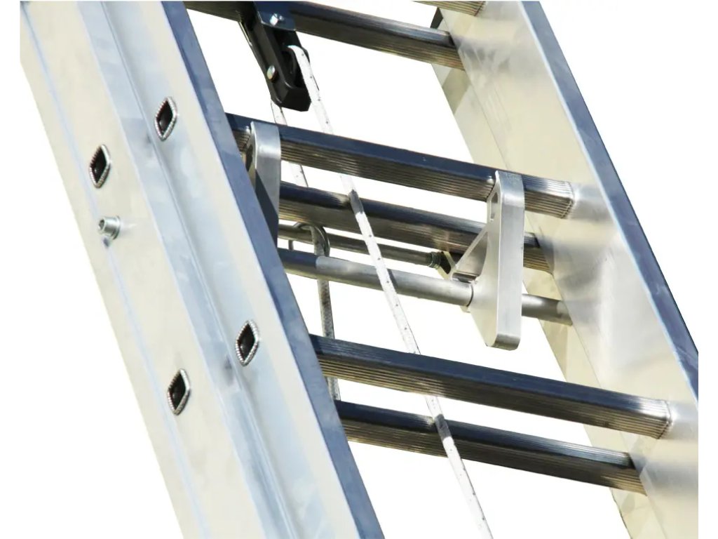 EURO E3F Trojdílný výsuvný žebřík s lanemTrojdílný výsuvný žebřík EURO E3F z drážkovaného hliníku je určen pro profesionální použití ve stavebnictví, údržbě a technických provozech. Robustní konstrukce z kvalitního hliníku zajišťuje vysokou pevnost, dlouhou životnost a zároveň nízkou hmotnost pro snadnou manipulaci. Žebřík splňuje požadavky evropské normy EN 131 a má nosnost 150 kg, což jej činí vhodným pro každodenní profesionální nasazení. Žebřík je rozdělen na tři díly. Prvním krokem je ruční vysunutí nejmenšího, třetího dílu. Poté se druhý a třetí díl vysunou současně pomocí lana a dvojité kladky, což výrazně usnadňuje manipulaci a zkracuje čas potřebný k nastavení požadované výšky. Součástí výbavy jsou také kolečka pro snadný posun po zdiV případě nechtěného uvolnění lana se kladka automaticky zachytí o nejbližší příčku, čímž zabrání samovolnému sesunutí horního dílu žebříku. Protiskluzové příčky o rozměru 27 × 27 mm s rozestupem 28 cm zajišťují pohodlný a stabilní nášlap. Žebřík je dále vybaven stabilizátorem s nylonovou výztuhou, zařízení pro blokaci vysunutí, které zabraňuje pohybu žebříku po dosažení bezpečnostního limitu, a protiskluzové gumové patky. Tyto prvky společně zaručují vysokou úroveň bezpečnosti a komfortu při práci ve výškách. |