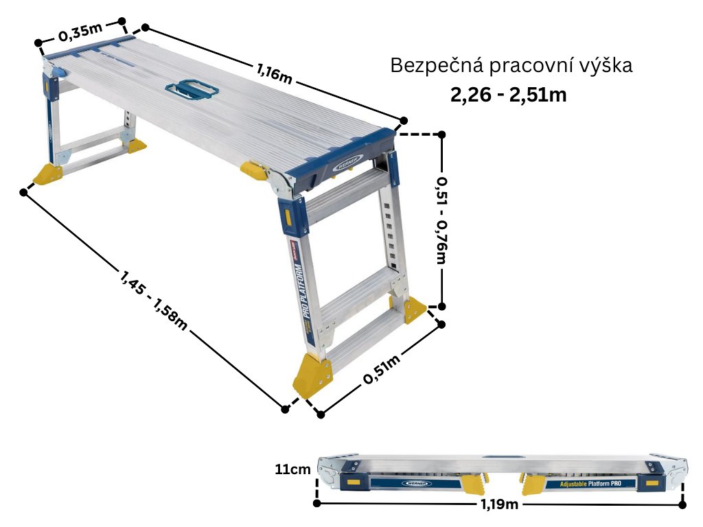 Werner AP2030L je inovativní profesionální teleskopická pracovní plošina, kterou lze spojit s neomezeným počtem dalších plošin AP2030L a vytvořit tak dlouhou, stabilní pracovní plochu přesně podle potřeb práce. Díky teleskopickým nohám umožňuje nastavení výšky nášlapné plochy od 0,51 m do 0,76 m a celkové pracovní výšky až 2,51 m.Plošina kombinuje bezpečnost, stabilitu a komfort při práci, a zároveň je snadno přenosná a skladná. Možnost použití i na schodišti z ní činí mimořádně všestrannou teleskopickou plošinu vhodnou pro profesionály i náročné kutily.