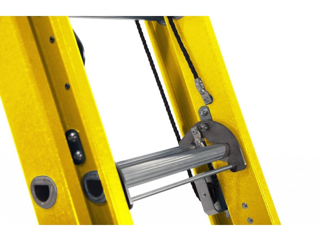 Se sklolaminátovými výsuvnými žebříky Werner toto zvládnete rychleji, efektivněji a pohodlněji, protože jsou je vybaveny lanem. Ovládáni je opravdu jednoduché. Stačí uvolnit pojistku a pomocí lana, které je upevněno přes kladkový systém žebřík vytáhnete do správné výšky. Po práci zase pomocí lana žebřík zpustíte. Žebřík jezdí nahoru a dolů bez problémů, protože bočnice jsou ve tvaru kolejnic a zapadají do sebe. Nemusíte se obávat, že by se vysouvaná část žebříku na vás vyklopila.