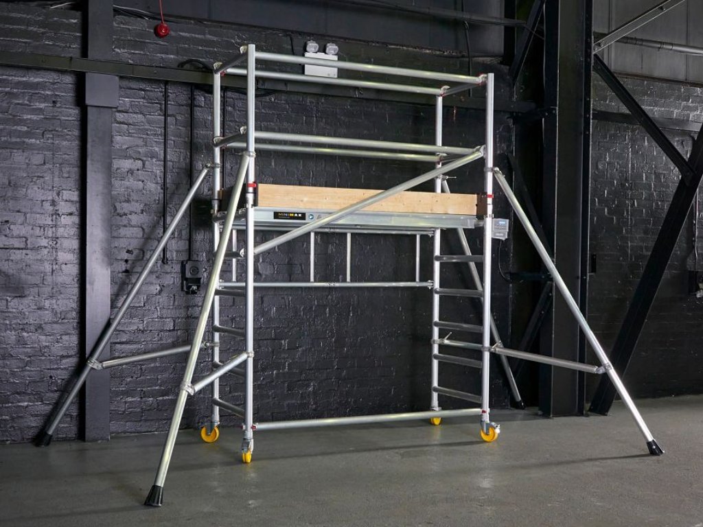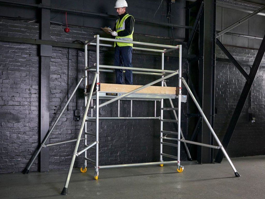 Skládací rám se systémem snap-click umožňuje rychlou a intuitivní montáž jednou osobou bez nutnosti použití nářadí. Modulární lešení lze snadno při zakoupení dílů individuálně rozšířit do větších výšek podle potřeby, přičemž nastavitelná výška pracovní plošiny zajišťuje univerzální využití při různých typech prací.