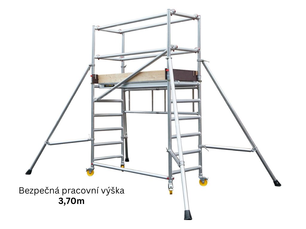 Díky rozestupu příčlí 260 mm je výstup pohodlný a bezpečný. O snadné přemístění se starají otočná kolečka s aretací, která zároveň zajišťují pevné a jisté ukotvení při práci. Konstrukce nabízí vysokou nosnost 153 kg/m² což z něj činí spolehlivé řešení pro řemeslníky, montážní firmy i další profesionály, kteří hledají odolné, skladné a bezpečné pracovní lešení.